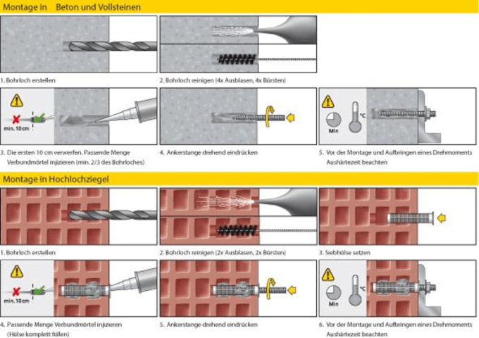 • Betonanwendungen mit Gewindestangen von M8–M30 (in galv. verzinktem, feuerverzinktem und rostfreiem Edelstahl) sowie Betonstahl Ø 8–32 mm, verschiedene Setztiefen, verwendbar ab –20 °C Untergrundtemperatur, großer Temperaturbereich bis max. +120 °