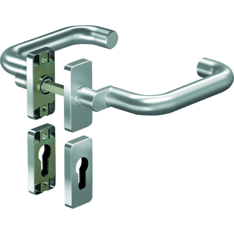OGRO Drückergarnitur Premium 8100A/6611; Produkttyp: Drückergarnitur; Produkttyp (Hersteller): Drückergarnitur; Ausführung: Rosette; Befestigungsart Drückerrosette (außen): verdeckt verschraubt; Befestigungsart Drückerrosette (innen): verdeckt verschraubt; Befestigungsart Schlüsselrosette (außen): verdeckt verschraubt; Befestigungsart Schlüsselrosette (innen): verdeckt verschraubt; Befestigungstechnik: ohne Stütznocken; Form Drückerrosette: eckig; Form Schlüsselrosette (außen): eckig; Form Schlüsselrosette (innen): eckig; Vierkant: 8 mm; Material: Edelstahl; Form Türgriff (innen): versetzt,U-Form; Form Türgriff (außen): versetzt,U-Form; Durchmesser Türgriff (innen): 22 mm; Durchmesser Türgriff (außen): 22 mm; Länge Türgriff (innen): 163 mm; Länge Türgriff (außen): 163 mm; Höhe Türgriff (innen): 81 mm; Höhe Türgriff (außen): 81 mm; Breite Drückerrosette (außen): 31,5 mm; Breite Drückerrosette (innen): 31,5 mm; Länge Drückerrosette (außen): 68,5 mm; Länge Drückerrosette (innen): 68,5 mm; Höhe Drückerrosette (außen): 9 mm; Höhe Drückerrosette (innen): 9 mm; Breite Schlüsselrosette (außen): 31,5 mm; Breite Schlüsselrosette (innen): 31,5 mm; Länge Schlüsselrosette (außen): 68,5 mm; Länge Schlüsselrosette (innen): 68,5 mm; Höhe Schlüsselrosette (außen): 9 mm; Höhe Schlüsselrosette (innen): 9 mm; Lagerung: wartungsfreies Gleitlager,mit Rückholfeder,festdrehbar; Einsatzbereich: Zimmertür,Objekttür; Türart: Rohrrahmen; Türwerkstoff: Aluminium,Kunststoff; Anwendung: außen/innen; Lochung: Profilzylinder gelocht; DIN-Richtung: DIN Links-Rechts; Farbe: grau; Farbton: edelstahl; Oberfläche: satino; Technik: Click&Go Technik; Ausführung Vierkant: Vierkantstift; Türstärke min.: 35 mm; Türstärke max.: 48 mm; Norm: DIN EN 1906