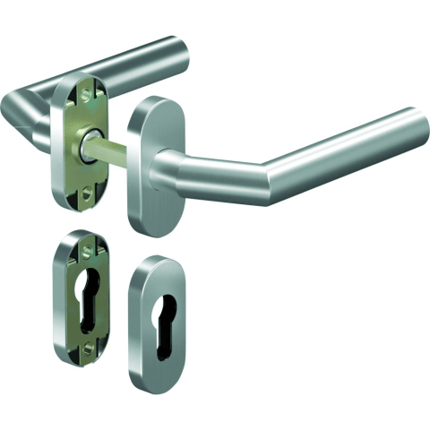 OGRO Drückergarnitur Premium 8906V/6621 FS; Produkttyp: Drückergarnitur; Produkttyp (Hersteller): Drückergarnitur; Ausführung: Rosette; Befestigungsart Drückerrosette (außen): verdeckt verschraubt; Befestigungsart Drückerrosette (innen): verdeckt verschraubt; Befestigungsart Schlüsselrosette (außen): verdeckt verschraubt; Befestigungsart Schlüsselrosette (innen): verdeckt verschraubt; Befestigungstechnik: ohne Stütznocken; Montageart: aufliegend; Form Drückerrosette: oval; Form Schlüsselrosette (außen): oval; Form Schlüsselrosette (innen): oval; Vierkant: 9 mm; Material: Edelstahl; Form Türgriff (innen): gekröpft,U-Form; Form Türgriff (außen): gekröpft,U-Form; Durchmesser Türgriff (innen): 20 mm; Durchmesser Türgriff (außen): 20 mm; Länge Türgriff (innen): 145 mm; Länge Türgriff (außen): 145 mm; Höhe Türgriff (innen): 59 mm; Höhe Türgriff (außen): 59 mm; Breite Drückerrosette (außen): 31,5 mm; Breite Drückerrosette (innen): 31,5 mm; Länge Drückerrosette (außen): 68,5 mm; Länge Drückerrosette (innen): 68,5 mm; Höhe Drückerrosette (außen): 9 mm; Höhe Drückerrosette (innen): 9 mm; Breite Schlüsselrosette (außen): 31,5 mm; Breite Schlüsselrosette (innen): 31,5 mm; Länge Schlüsselrosette (außen): 68,5 mm; Länge Schlüsselrosette (innen): 68,5 mm; Höhe Schlüsselrosette (außen): 9 mm; Höhe Schlüsselrosette (innen): 9 mm; Lagerung: wartungsfreies Gleitlager,mit Rückholfeder,festdrehbar; Einsatzbereich: Objekttür; Türart: Rohrrahmen; Türwerkstoff: Aluminium,Kunststoff; Anwendung: außen/innen; Lochung: Profilzylinder gelocht; DIN-Richtung: DIN Links-Rechts; Farbe: grau; Farbton: edelstahl; Oberfläche: satino; Technik: Click&Go Technik; Ausführung Vierkant: Vierkantstift; Türstärke min.: 35 mm; Türstärke max.: 48 mm; Norm: DIN 18273,DIN EN 1906; Zulassung: für Feuerschutz,für Rauchschutz