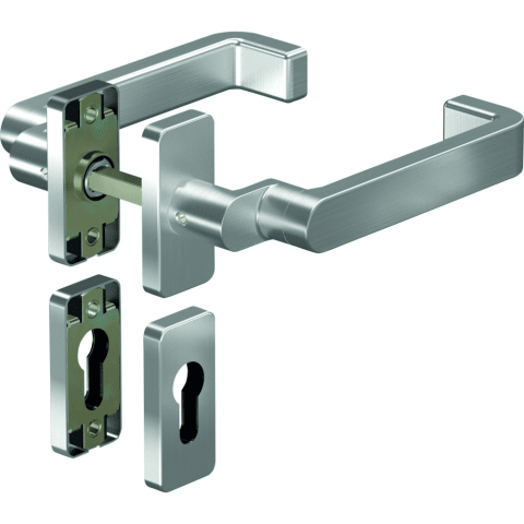 OGRO Drückergarnitur 8991A/6621SR FS; Produkttyp: Drückergarnitur; Produkttyp (Hersteller): Drückergarnitur; Ausführung: Rosette; Befestigungsart Drückerrosette (außen): verdeckt verschraubt; Befestigungsart Drückerrosette (innen): verdeckt verschraubt; Befestigungsart Schlüsselrosette (außen): verdeckt verschraubt; Befestigungsart Schlüsselrosette (innen): verdeckt verschraubt; Befestigungstechnik: ohne Stütznocken; Montageart: aufliegend; Form Drückerrosette: oval; Form Schlüsselrosette (außen): oval; Form Schlüsselrosette (innen): oval; Vierkant: 9 mm; Material: Edelstahl; Form Türgriff (innen): versetzt,Design; Form Türgriff (außen): versetzt,Design; Länge Türgriff (innen): 156 mm; Länge Türgriff (außen): 156 mm; Höhe Türgriff (innen): 61 mm; Höhe Türgriff (außen): 61 mm; Breite Drückerrosette (außen): 31,5 mm; Breite Drückerrosette (innen): 31,5 mm; Länge Drückerrosette (außen): 68,5 mm; Länge Drückerrosette (innen): 68,5 mm; Höhe Drückerrosette (außen): 9 mm; Höhe Drückerrosette (innen): 9 mm; Breite Schlüsselrosette (außen): 31,5 mm; Breite Schlüsselrosette (innen): 31,5 mm; Länge Schlüsselrosette (außen): 68,5 mm; Länge Schlüsselrosette (innen): 68,5 mm; Höhe Schlüsselrosette (außen): 9 mm; Höhe Schlüsselrosette (innen): 9 mm; Lagerung: wartungsfreies Gleitlager,mit Rückholfeder,festdrehbar; Einsatzbereich: Objekttür; Türart: Rohrrahmen; Türwerkstoff: Aluminium,Kunststoff; Anwendung: außen/innen; Lochung: Profilzylinder gelocht; DIN-Richtung: DIN Links-Rechts; Farbe: grau; Farbton: edelstahl; Oberfläche: satino; Technik: Click&Go Technik; Ausführung Vierkant: Vierkantstift; Design Türdrücker: by Botti; Türstärke min.: 35 mm; Türstärke max.: 48 mm; Norm: DIN 18273,DIN EN 179,DIN EN 1906; Zulassung: für Feuerschutz,für Fluchttüren,für Rauchschutz