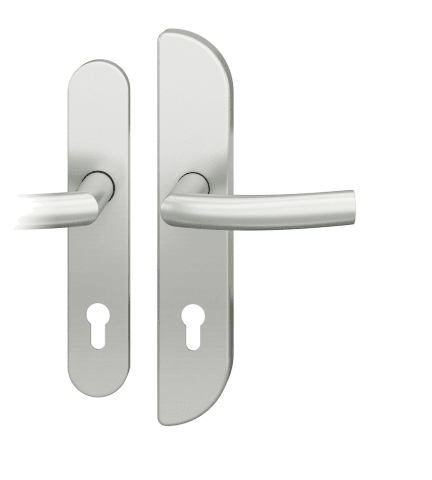 FSB, Haustür-Schutz-Drückergarnitur, Abdeckung: Langschild, Modellnummer: 73 7388, Lochung: Profilzylinder gelocht, Entfernung: 92mm, Vierkant: 10mm, Material: Aluminium, Farbton: naturfarbig, Oberfläche: eloxiert, DIN-Richtung: DIN Rechts, Befestigungsart: verdeckt verschraubt, Befestigungstechnik: mit Stütznocken, Befestigungssystem: Stiftverbindung, Schildbreite außen: 54mm, Schildbreite innen: 45mm, Schildlänge außen: 286mm, Schildlänge innen: 245mm, Anschlagrichtung: Drücker rechts zeigend, Drückerbefestigung: Stabilstift, Form: Design, Schildstärke außen: 11mm, Schildstärke innen: 7mm, Türstärke min.: 67mm, Türstärke max.: 69mm, Türart: Abschlusstüren,Türwerkstoff : Holz, Stahl, Benutzerklasse: Klasse 4, Widerstandsklasse: SK2, Norm: DIN EN 1906, DIN 18257