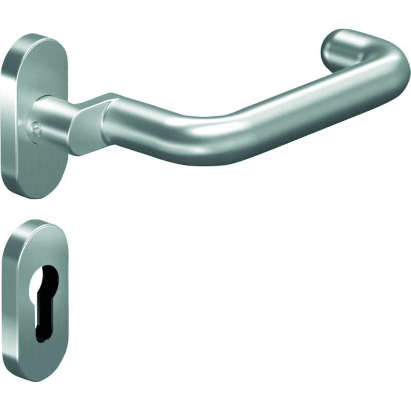 OGRO Drücker-Halbgarnitur Premium 8101A/6621/6679 FS; Material: Edelstahl; Befestigungsart: verdeckt verschraubt; Befestigungstechnik: ohne Stütznocken; Abdeckung: mit Rosetten; Form: oval; Benutzerklasse: Klasse 4; Stärke Abdeckung: 9 mm; Einsatzbereich: Feuerhemmend; Basis: Drücker-Halbgarnitur; Lochung: Profilzylinder gelocht; Vierkant: 9 mm; Befestigungssystem: Stiftverbindung; Zulassung: für Rauchschutz,für Feuerschutz,für Notausgänge; DIN-Richtung: DIN Links-Rechts; Lagerung: Gleitlager,festdrehbar mit Hochhaltemechanik; Breite: 31 mm; Länge: 69 mm; Oberfläche: satino; Farbton: edelstahl; Norm: DIN EN 179,DIN EN 1906,DIN 18273; Türart: Außentüren,Rahmentüren,Fluchttüren; Drückerbefestigung: Vollstift; Anschlagrichtung: Drücker rechts/links verwendbar; Türwerkstoff: Aluminium,Kunststoff; Drückerhöhe: 81 mm; Drückerform: versetzt,U-Form; Drückerdurchmesser: 20 mm