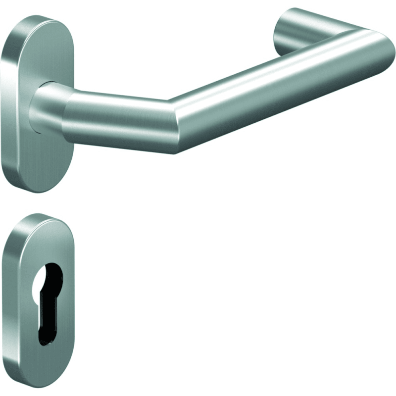 OGRO Drücker-Halbgarnitur Premium 8907V/6620/6679 FS; Material: Edelstahl; Befestigungsart: verdeckt verschraubt; Befestigungstechnik: ohne Stütznocken; Abdeckung: mit Rosetten; Form: oval; Benutzerklasse: Klasse 4; Stärke Abdeckung: 9 mm; Einsatzbereich: Feuerhemmend; Basis: Drücker-Halbgarnitur; Lochung: Profilzylinder gelocht; Vierkant: 9 mm; Befestigungssystem: Stiftverbindung; Zulassung: für Rauchschutz,für Feuerschutz,für Notausgänge; DIN-Richtung: DIN Links-Rechts; Lagerung: festdrehbar,Gleitlager; Breite: 31 mm; Länge: 69 mm; Oberfläche: satino; Farbton: edelstahl; Norm: DIN 18273,DIN EN 179,DIN EN 1906; Türart: Außentüren,Rahmentüren,Fluchttüren; Drückerbefestigung: Vollstift; Anschlagrichtung: Drücker rechts/links verwendbar; Türwerkstoff: Aluminium,Kunststoff; Drückerform: gekröpft,Gehrung,U-Form