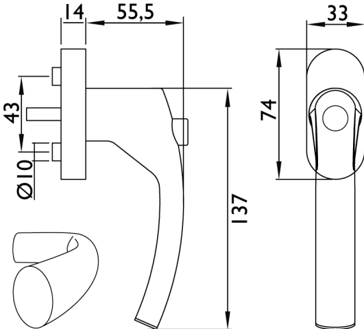 Drehkipp-Rasterolive 1807 DKI BASIC 07, Stiftlänge 24/31 + 36/42 mm vorstehend, Druckknopf im Griffteil, Schrauben M5 x 50 mm, Oberfl. 60 (Edelstahl matt)