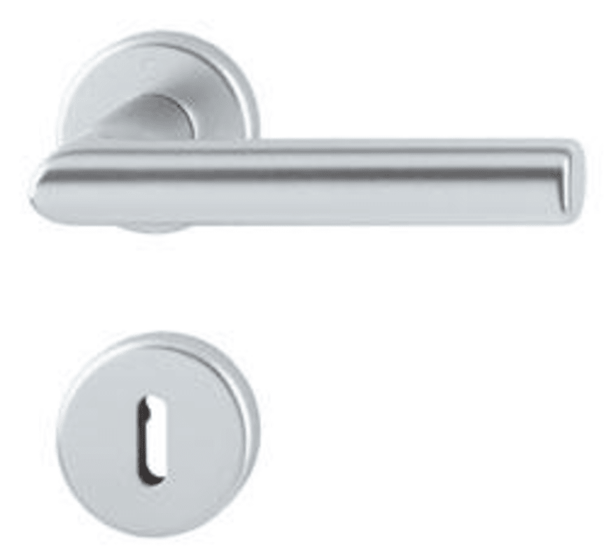 Türdrückergarnitur aus Aluminium mit Profilstift-Verbindung, Kunststoff-Unterkonstruktion mit Stütznocken, Verdeckte durchgehende Verschraubung.
