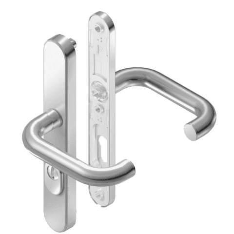 BKS Schutz-Drückergarnitur RONDO B-73060; Abdeckung: Langschild; Widerstandsklasse: ES 3 (SK4); Form: oval; Vierkant: 8 mm; Material: Edelstahl; Lagerung: festdrehbar,wartungsfrei; Befestigungstechnik