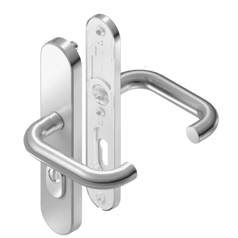 BKS Schutz-Drückergarnitur RONDO B-75030; Abdeckung: Langschild; Widerstandsklasse: ES 3 (SK4); Form: oval; Vierkant: 9 mm; Material: Edelstahl; Lagerung: wartungsfrei,festdrehbar; Befestigungstechnik