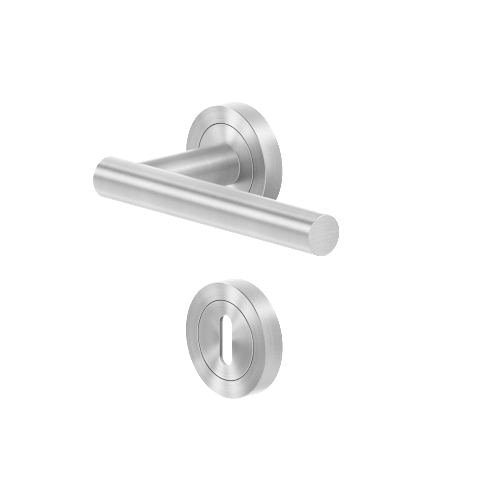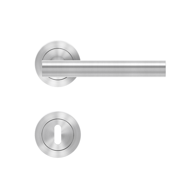 Innentür-Rosettengarnitur ER21 Manhattan, für Standardtüren nach DIN EN 1906, Benutzungskategorie 3. Mit patentierte 3teiliger Schraubrosette kantig, mit 7 mm Stütznocken und Gleitlager aus Nylon, fest drehbar gelagert mit Hochhaltefeder, durchgehende M4 Schrauben, unsichtbar befestigt, 8 mm exzentrisch gebohrter Hohlstift. Griffdurchmesser: 19 mm.