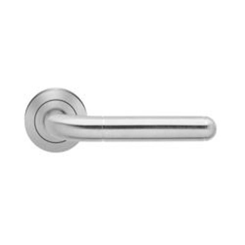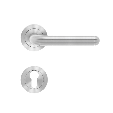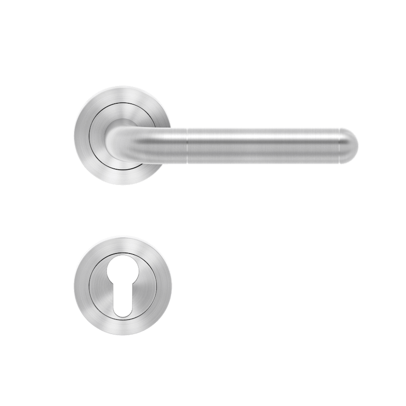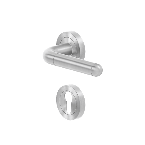 Innentür-Rosettengarnitur ER35 Lignano Steel, für Standardtüren nach DIN EN 1906, Benutzungskategorie 3. Mit patentierter 3teiliger Schraubrosette kantig, mit 7 mm Stütznocken und Gleitlager aus Nylon
