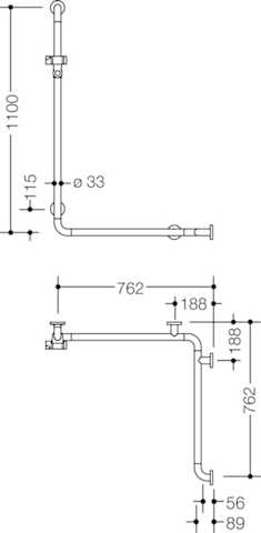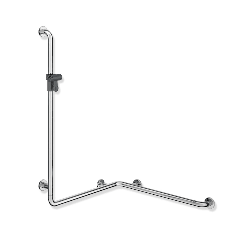 aus hochwertigem Edelstahl, pulverbeschichtet in den HEWI Farben DX (Weiß tiefmatt), DC (Schwarz tiefmatt) und SC (Dunkelgrau Perlglimmer tiefmatt), waagerecht angeordnete Stangen mit Befestigungsrosetten, Ausführung rechts, waagerechte Längen 765 mm und 475 mm, 87 mm tief, Stangendurchmesser 30 mm, Rohrstärke 2 mm, Rosettendurchmesser 70 mm, inklusive HEWI Befestigungsmaterial.