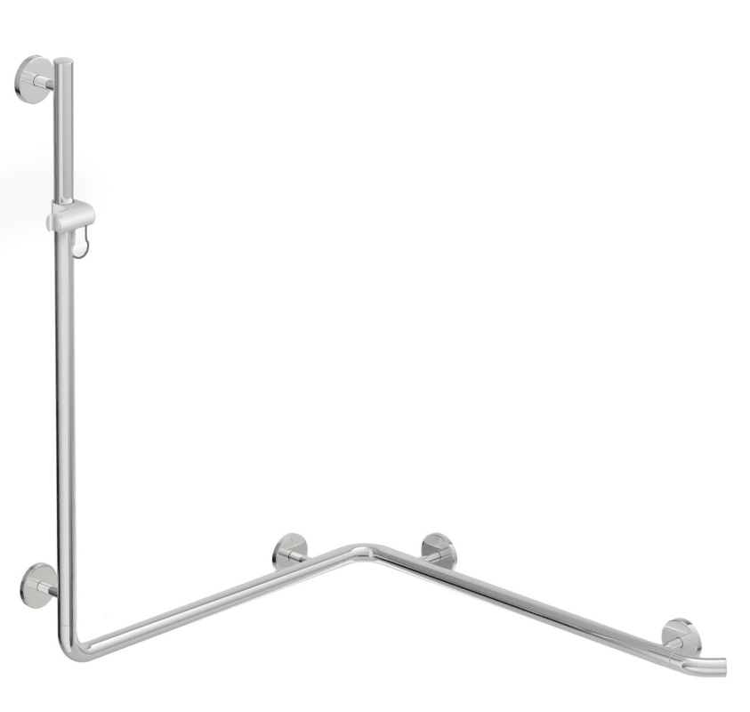HEWI Dusch-, Wannenhandlauf mit Brausehalterstange WARM TOUCHsenkrecht und waagerecht angeordnete, im rechten Winkel verbundene Stangen mit Brausehalter, aus hochwertigem chromoptisch beschichtetem Po