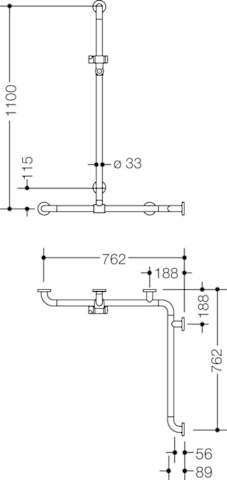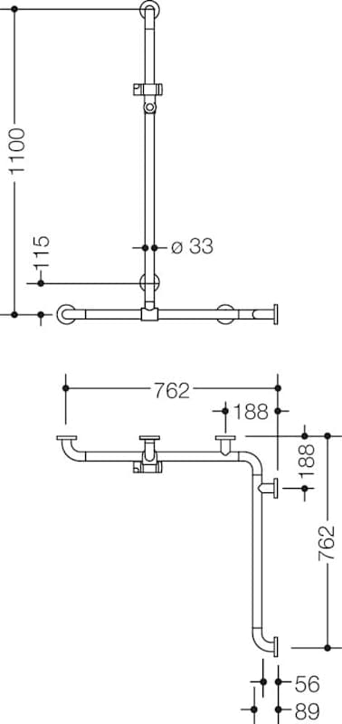 Polyamid, chromoptisch beschichtet, mit stufenlos verstellbarem Brausehalter in HEWI Farbe 92 (Anthrazitgrau), senkrechte Länge 1100 mm, waagerechte Längen (Eckmontage) 762 mm, Durchmesser 33 mm, links- und rechtsseitig montierbar.