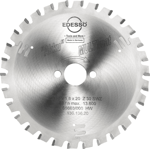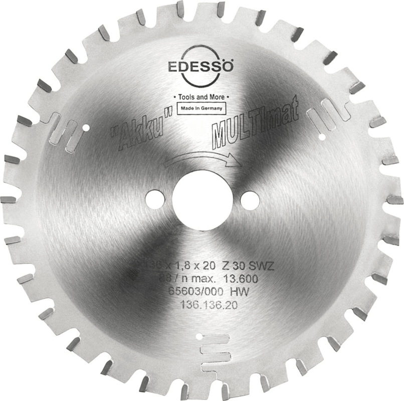 HW-Handkreissägeblatt Akku MULITmat Super-Wechselzahn• Zum Einsatz auf akkubetriebenen Handkreissägen optimiert • Zum Trennen von Holz mit Nägeln, Massivholz, Holzwerkstoffen, Kunststoffen, Alu-Prof
