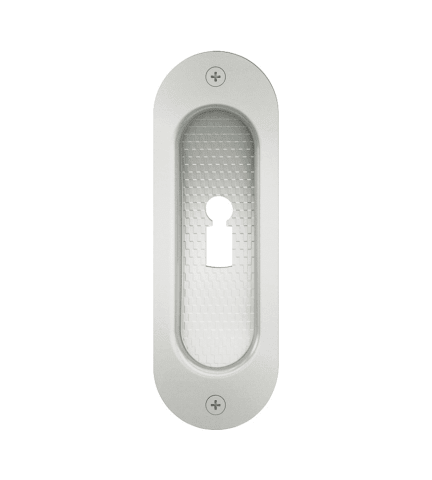 FSB, Zimmertür-Schiebetürmuschel, Modellnummer: 42 4212, Lochung: Buntbart gelocht, Form: oval, Material: Aluminium, Farbton: verkehrsweiß, Oberfläche: glanz, Befestigungsart: zum Einlassen, zum Anschrauben, Länge: 120 mm, Breite: 40 mm, Tiefe: 11,5 mm, DIN-Richtung: DIN Links-Rechts, Türart: Schiebetür, Türflügelanzahl: einflügelig, zweiflügelig, Türwerkstoff: Holz