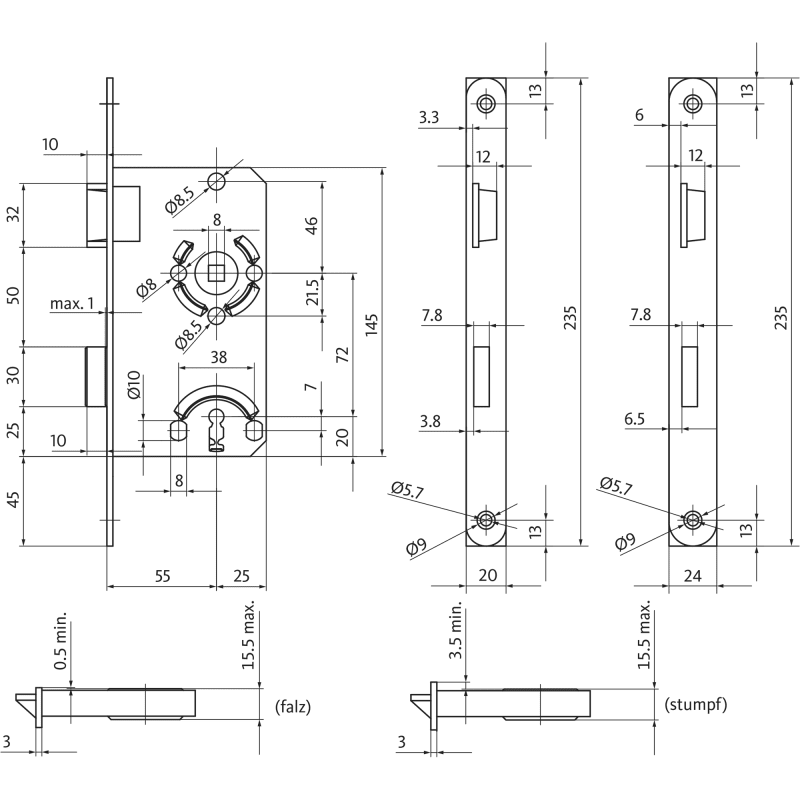 BKS Einsteckschloss 0215; Produkttyp: Einsteckschloss; Produkttyp (Hersteller): Einsteckschloss; Ausführung: mechanisch; Verriegelung: manuell; Entriegelung: manuell; Drückernuss: einteilig; Stulpform: Flachstulp; Material Stulp: Edelstahl; Schlosskasten: geschlossen; Schlosskastenhöhe: 145 mm; Schlosskastenstärke: 15,5 mm; Norm: DIN 18251; Schlossklasse: Klasse 1; Türart: Vollblatt; Türflügelanzahl: einflügelig; Türwerkstoff: Holz,Stahl; Einsatzbereich: Gangflügel; Dornmaß: 55 mm; Hinterdornmaß: 25 mm; Drückernussvierkant: 8 mm; Entfernung: 72 mm; Lochung: Buntbart gelocht; DIN-Richtung: DIN Links; Stulpausführung: kantig; Stulpbreite: 20 mm; Stulplänge: 235 mm; Stulpstärke: 3 mm; Farbton Stulp: edelstahl; Oberfläche Stulp: matt; Material Falle: Zinkdruckguss; Schlossriegel: 1 tourig; Riegelausschluss: 10 mm; Einbautiefe Schlosskasten: 77 mm; Wechsel: ohne Wechsel