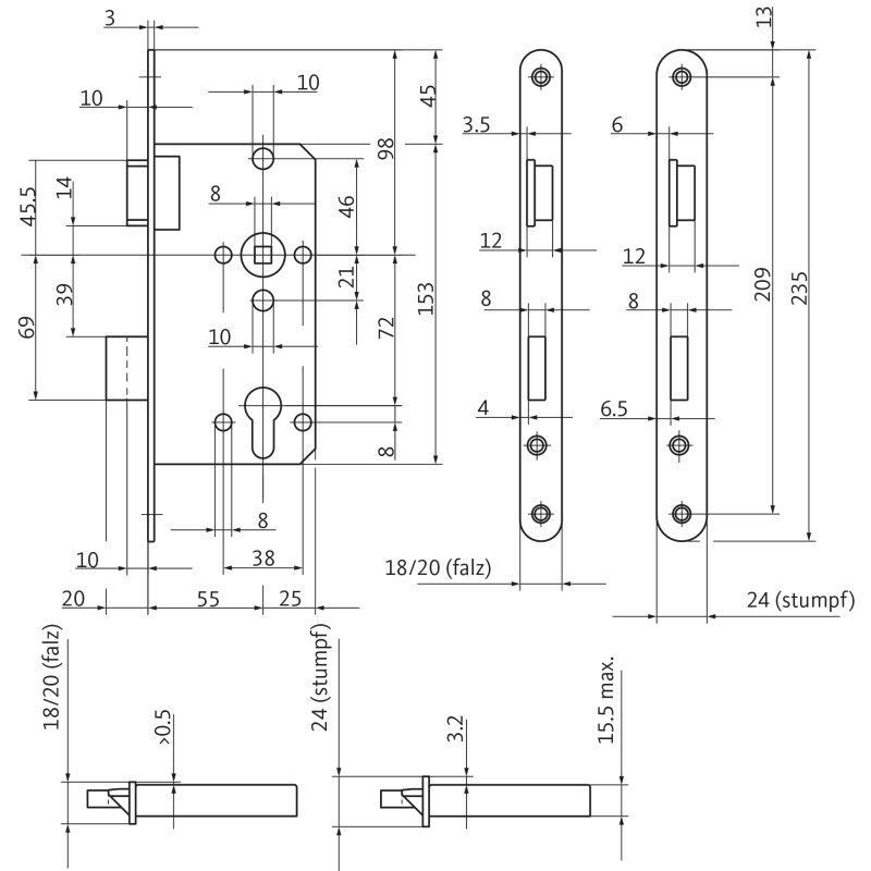 BKS Einsteckschloss 0415; Produkttyp: Einsteckschloss; Produkttyp (Hersteller): Einsteckschloss; Ausführung: mechanisch; Verriegelung: manuell; Entriegelung: manuell; Drückernuss: einteilig; Stulpform: Flachstulp; Material Stulp: Edelstahl; Schlosskasten: geschlossen; Schlosskastenhöhe: 153 mm; Schlosskastenstärke: 15,5 mm; Norm: DIN 18251; Schlossklasse: Klasse 2; Türart: Vollblatt; Türflügelanzahl: einflügelig; Türwerkstoff: Holz,Stahl; Einsatzbereich: Gangflügel; Dornmaß: 55 mm; Hinterdornmaß: 25 mm; Drückernussvierkant: 8 mm; Entfernung: 72 mm; Lochung: Profilzylinder gelocht; DIN-Richtung: DIN Rechts; Stulpausführung: kantig; Stulpbreite: 20 mm; Stulplänge: 235 mm; Stulpstärke: 3 mm; Farbton Stulp: edelstahl; Oberfläche Stulp: gebürstet; Material Falle: Zinkdruckguss; Schlossriegel: 2 tourig; Riegelausschluss: 20 mm; Einbautiefe Schlosskasten: 77 mm; Wechsel: mit Wechsel; Zusatzinformation: Falle vernickelt
