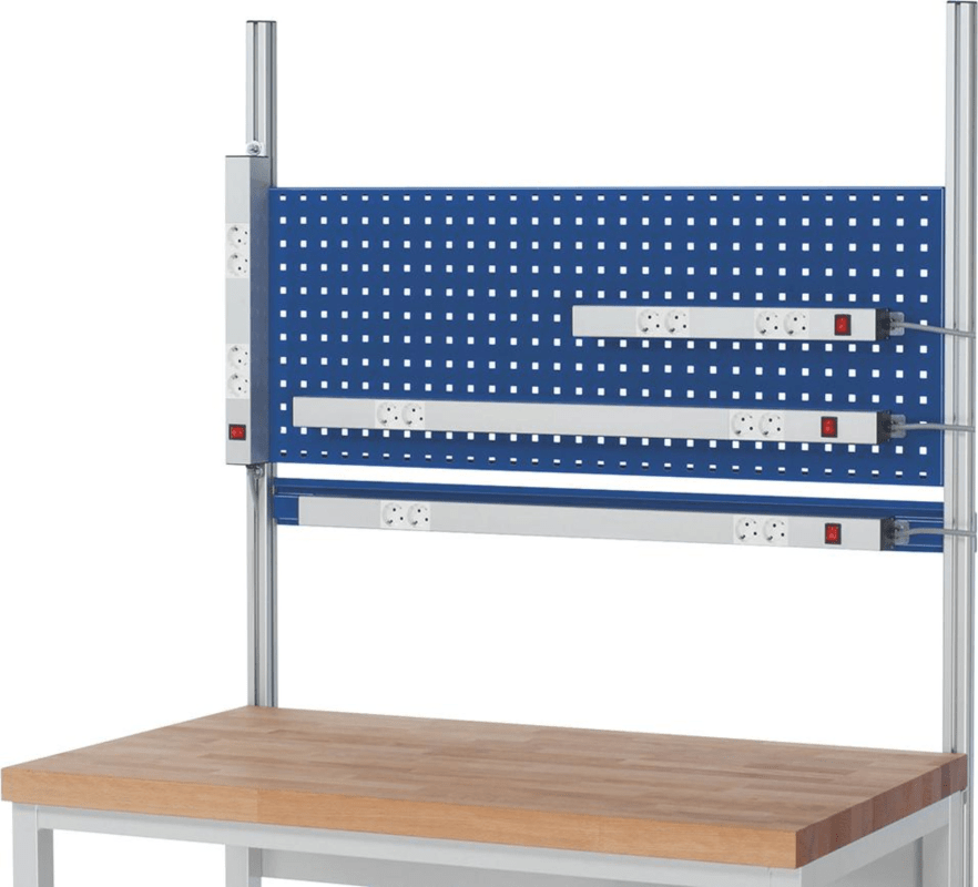 Energieleiste • Aluminiumkanal mit 2x 2 Schutzkontaktsteckdosen (offen) • Ein-/Ausschalter, Anschlusskabel und Stecker • Geeignet für alle Feldbreiten • Montage an: Systemstütze (vertikal) - allseit