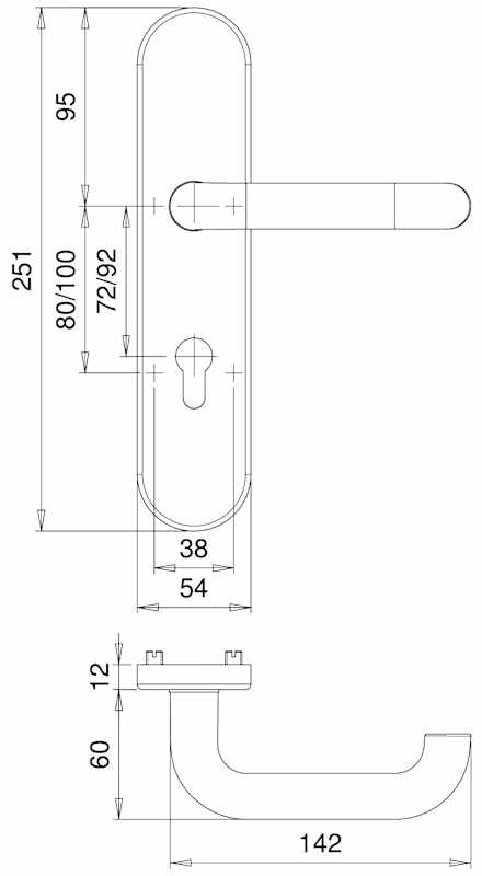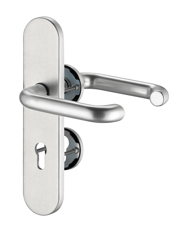 Schutz-Kombi-Drückergarnitur Metis 8721/7203, Langschild/Rosette, 12mm, ES 1, ohne Zylinderabdeckung, Profilzylinder gelocht, Entfernung 72mm, Vierkant 8mm, TS 35 - 45mm, grau, edelstahl, matt
