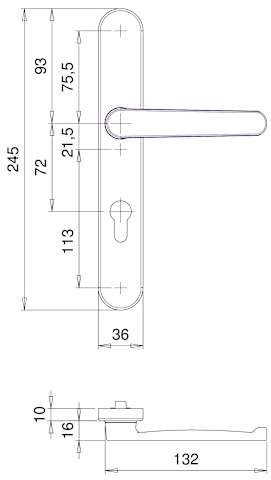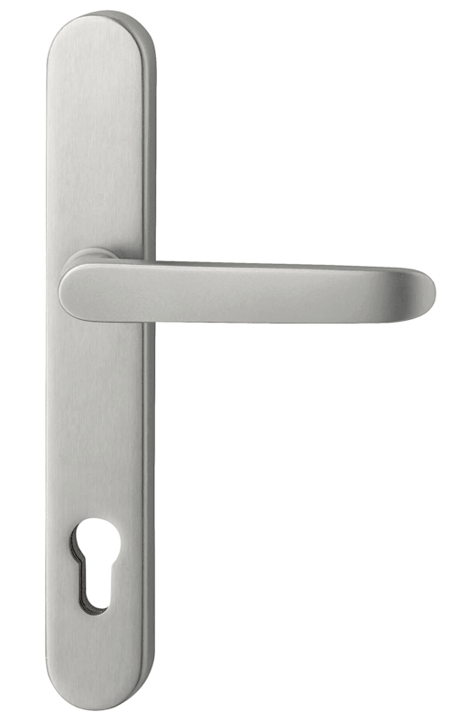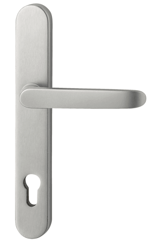 Drückergarnitur Kronos 1200/9635, Langschild oval, Profilzylinder gelocht, Entfernung 72mm, Vierkant 8, DIN Links-Rechts, mit Stütznocken, edelstahl matt, festdrehbar