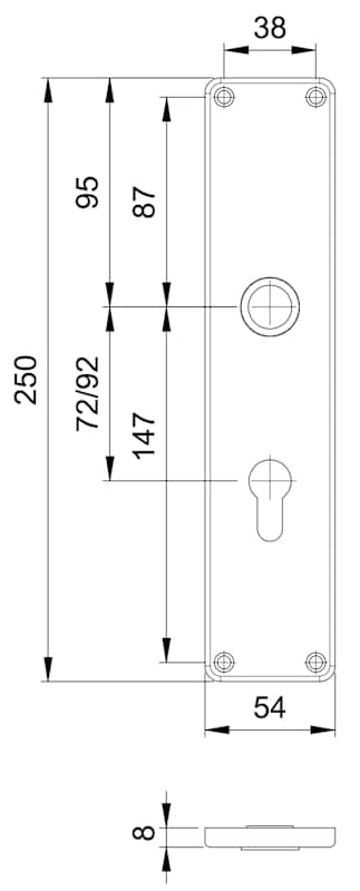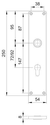 Langschild 2220, innen, eckig, ohne Stütznocken, Profilzylinder gelocht, Entfernung 92mm, Türstärke min. Türstärke 40- Türstärke max. 45mm, grau, edelstahl, matt