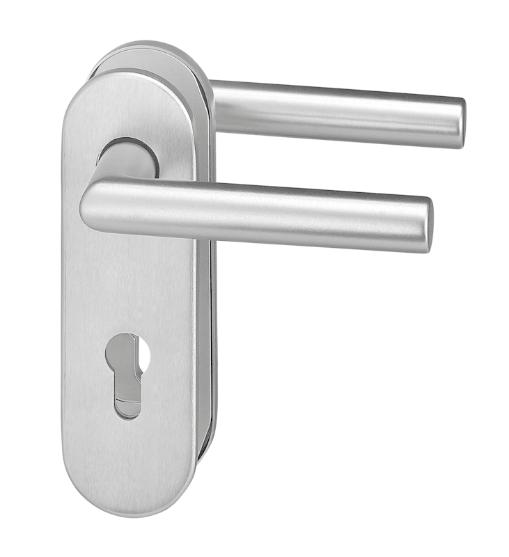 Vollblatt Sicherheits-Drückergarnitur Logo 8793/7203,Kurzschild,ohne Zylinderabdeckung 72/8,DIN Links-Rechts,edelstahl matt,Türstärke35-45,Gehrung/Gehrung