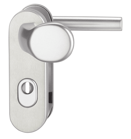 Vollblatt Sicherheits-Wechselgarnitur Logo 8795/0272,Kurzschild,mit Zylinderabdeckung 72/8,DIN Links-Rechts,edelstahl matt,Türstärke35-45,gekröpft/Gehrung fest