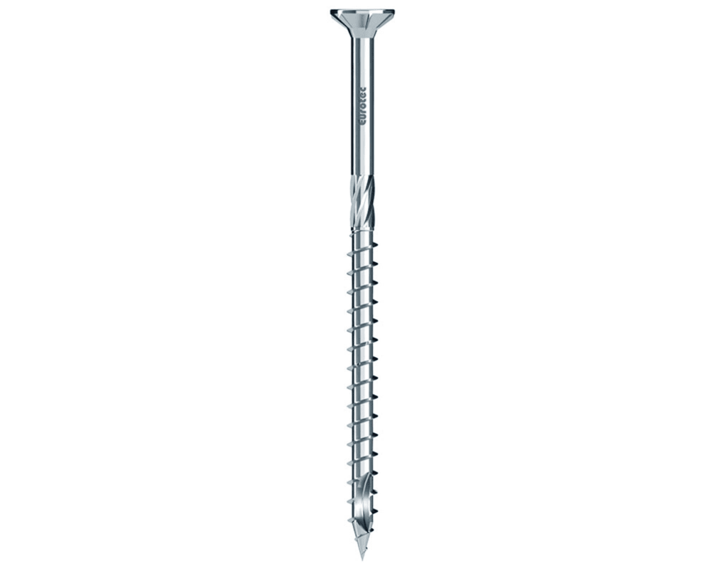 Die Schabenut an der Schraubenspitze sorgt für ein schnelles „Beißen“ auch in z. B.OSB. Die Fräsrippen hinter dem Gewinde räumen den Schaft frei, so dass auch lange Schrauben einfach gesetzt werden können.