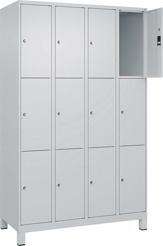 Fächerschrank Classic PLUS, 3 Türen übereinander, mit Füße • Stahlkonstruktion mit hochwertiger Einbrennbeschichtun • Füße aus Kunststoff, 150 mm hoch, bei Korpusfarbe RAL 7035 in lichtgrau, sonst schwarzgra • Glatte Türen, rechts angeschlagen mit Anschlagdämpfer, mit Zylinderschloss (inkl 2 Schlüsseln • Fußteil serienmäßig verzinkt für erhöhten Korrosionsschut • Hohe Stabilität durch Materialdoppelung an den entscheidenden Stelle • Schmale Seitenkanten für homogene Optik bei Reihenstellung