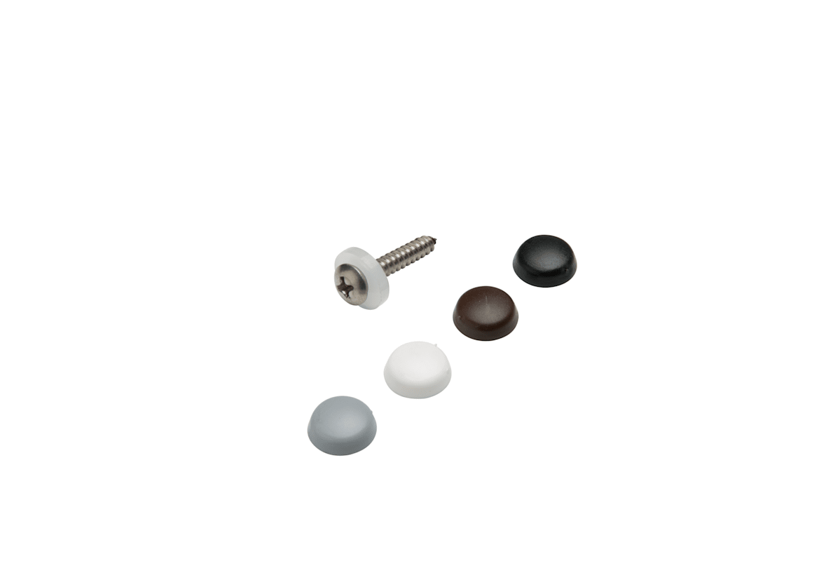 Fensterbank-Befestigungsschrauben aus Edelstahl, 3,9 x 22 mm, mit Unterlagscheibe und Kappen aus Kunststoff (braun, grau, weiß, schwarz, transparent).