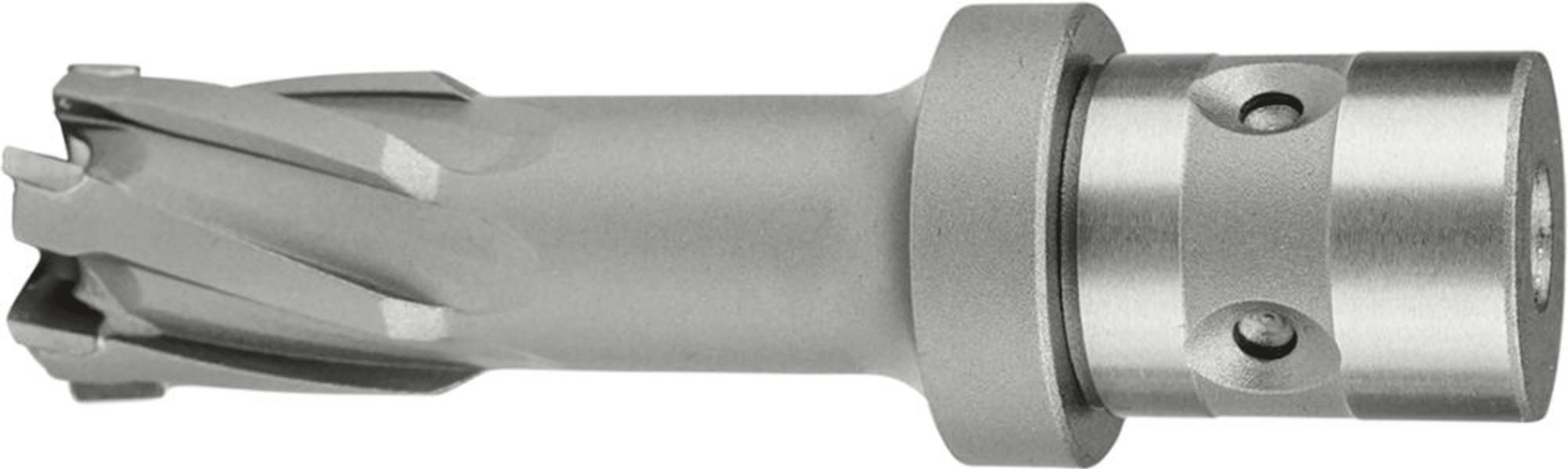 HM-Kernbohrer QuickIN• HM-bestückt • Kernbohrer zerspant nur einen dünnen Materialring • Ausstoßen des stehengebliebenen Bohrkerns über Führungs- und Auswerfstift durch Federkraft • Schnelle Abfüh
