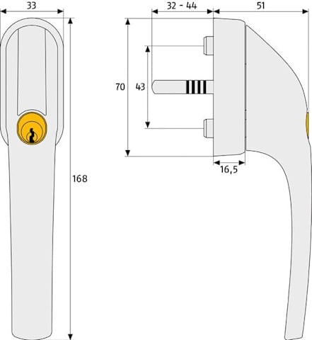 Fenstergriff FG 30 • Individuell einstellbarer, gesicherter Vierkantstift, 32 - 44 mm Länge • 4-Kant-Stift 7 mm, Schraubenabstand 43 mm • Nach DIN 18267 Klasse 2 • 200Nm Abdreh- und Abreißfestigkei • Verschleißarme Vierfach-Kugelverrastun • Inkl. 2 Schlüssel
