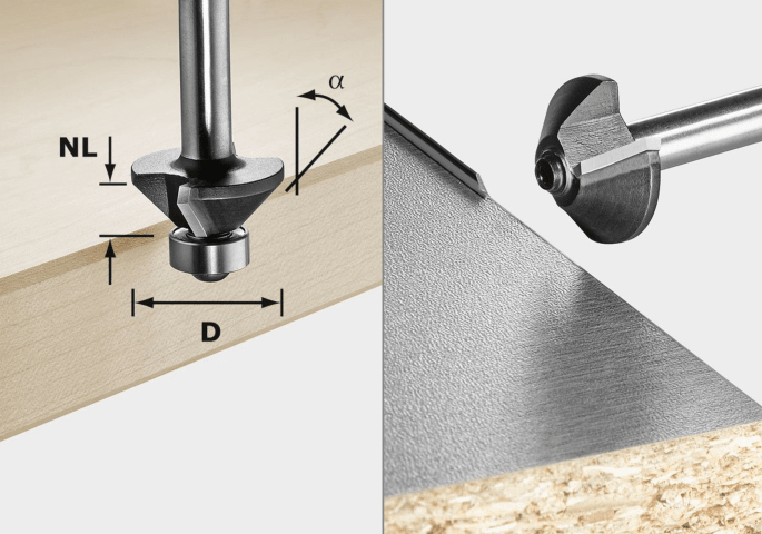 The chamfer router bit can be used with or without a ball bearing. It is suitable for both plastic and solid wood edges.