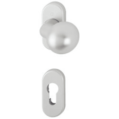 Aluminium-Feuerschutz-Profiltür-Rosetten-Halbgarnitur: geprüft nach DIN 18273, verkröpfter Knopf feststehend mit HOPPE-FDW-Profilvollstift-Verbindung und Klemmfeder zum Toleranzausgleich in der Schlos