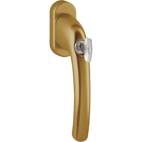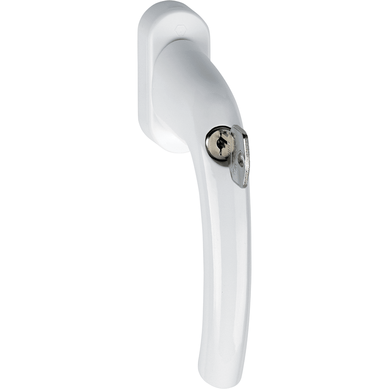 Aluminium-Fenstergriff, abschließbar Secu100®: Erfüllt die Anforderungen nach DIN V ENV 1627-1630 (WK1-6), federnd gelagerte, drehbare Abdeckkappe, Kunststoff-Rosette mit Stütznocken, 7 mm Vollstift, Seitenrastung mit positionsgenauer Raststellung, Druckzylinder mit Wendeschlüssel.