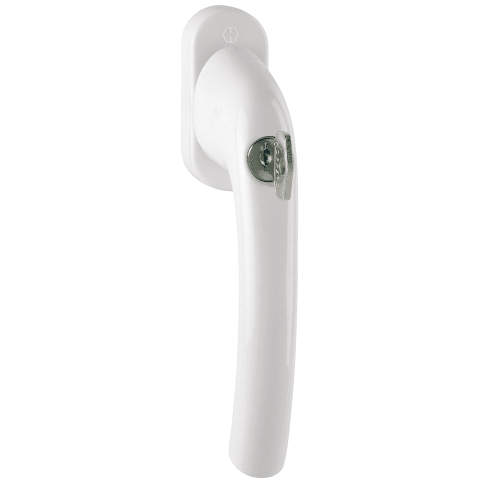 Aluminium-Fenstergriff, abschließbar, federnd gelagerte, drehbare Abdeckkappe, Kunststoff-Rosette mit Stütznocken, 7 mm Vollstift, Seitenrastung mit positionsgenauer Raststellung, Druckzylinder mit Wendeschlüssel.