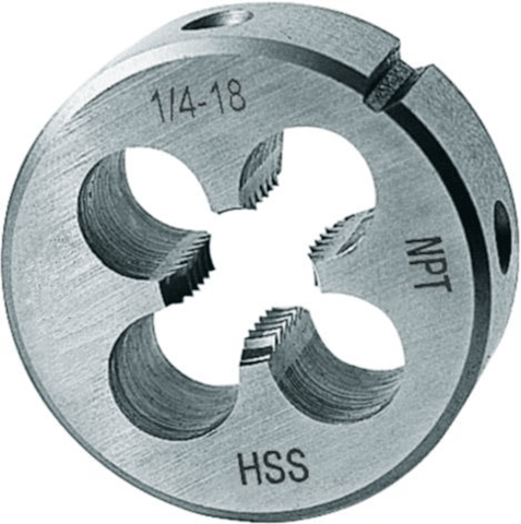 Schneideisen, blank• NPT-Gewinde, Rohrgewinde, kegelig 1/16, ANSI B1.20.1 • HSS • DIN EN 22568 • Geschlossene, vorgeschlitzte Form • Anschnitt einseitig 1,75 x Steigung • Lehrenhaltige Außengewin