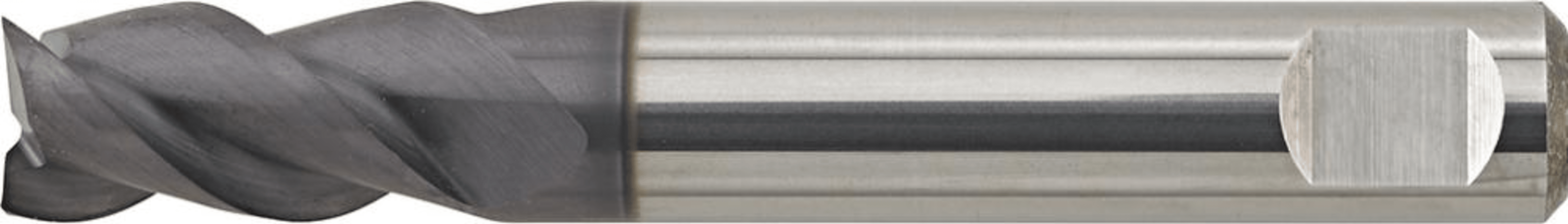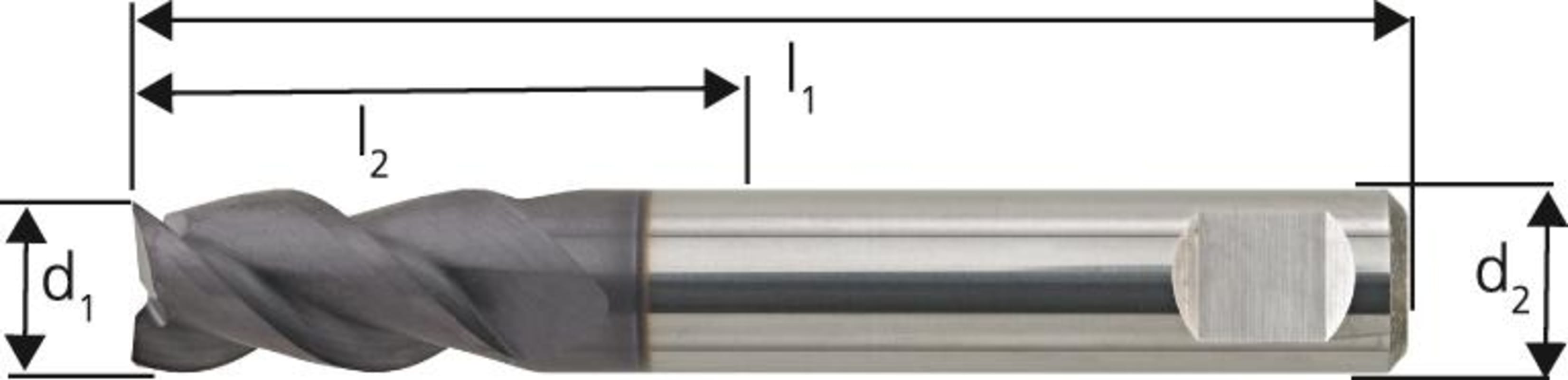 VHM-Mini-Schaftfräser, TiAlN-beschichtet• Ausführung: extrakurz • VHM UF • Typ NH • 3 Schneiden • Werksnorm • Zum Fräsen von Keil- und Passfedernuten, für die universelle Bearbeitung • Drall