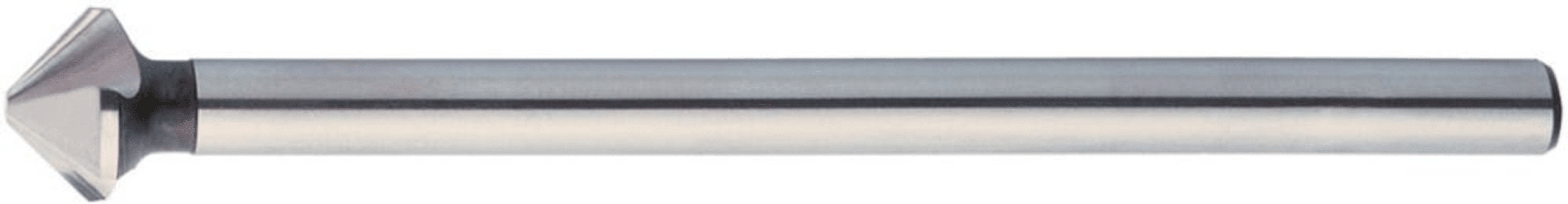 Kegel- und Entgratsenker 90°, extralang• HSS • Ähnlich DIN 335-C • 3 Schneiden • Spitzenwinkel 90° • Axial und radial hinterschliffen • Mit Span- und Freiwinkeln • Gerade Spannuten • Schaft (DI
