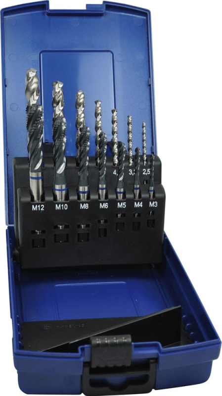 Grundloch-Maschinengewindebohrer-Satz mit Spiralbohrer, dampfbehandelt• Metrisches ISO-Gewinde DIN 13 • Toleranz ISO 2 6H • Form C (2–3 Gang) • Rechtsspirale 40° • M3-M10 nach DIN 371 mit verstärk