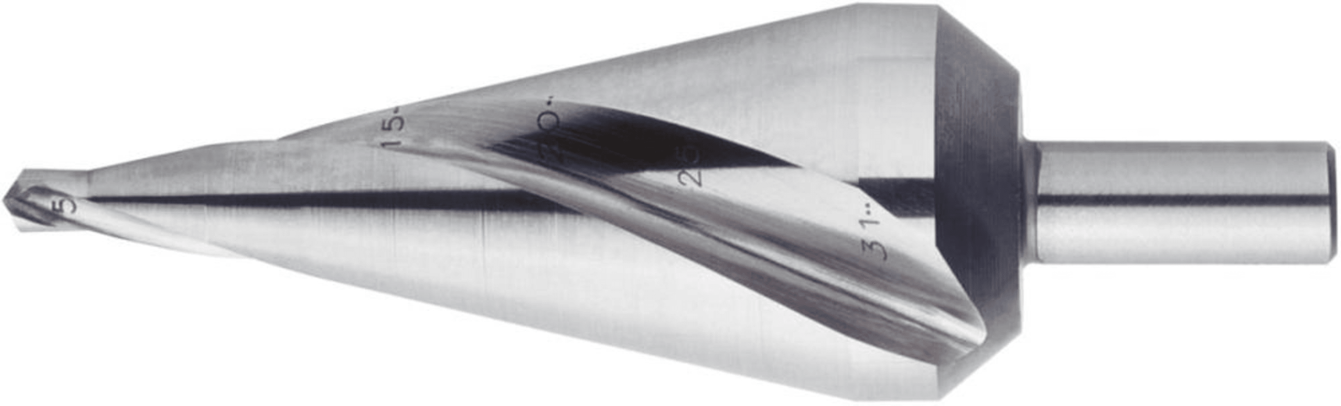 Präzisions-Blechschälbohrer, blank• HSS • Werksnorm • Lasersignierung der Loch-Ø und Drehzahlen • Spiralgenutet • Durchrutschen im Bohrfutter wird durch 3-Flächenschaft verhindert • Kreuzanschlif