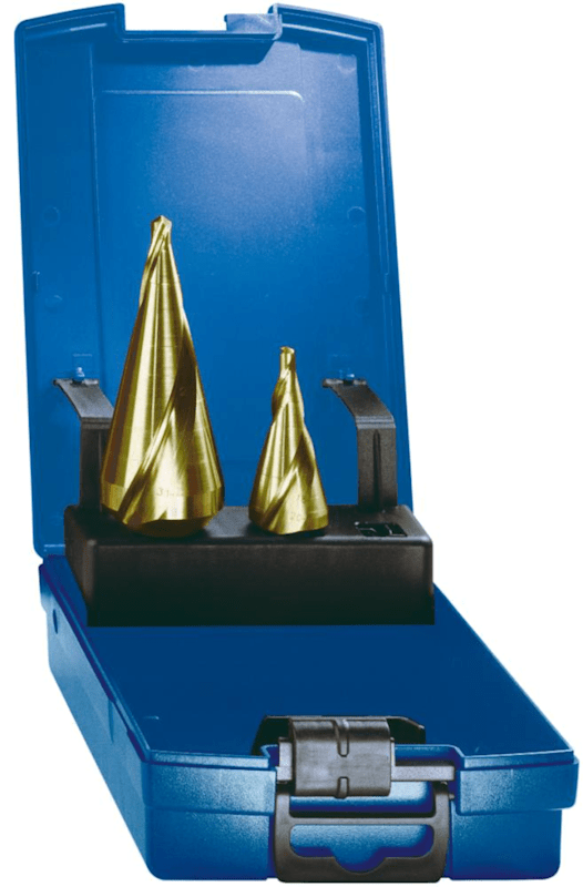 Präzisions-Blechschälbohrer-Satz, TiN-beschichtet• HSS • Werksnorm • Lasersignierung der Loch-Ø und Drehzahlen • Spiralgenutet • Durchrutschen im Bohrfutter wird durch 3-Flächenschaft verhindert