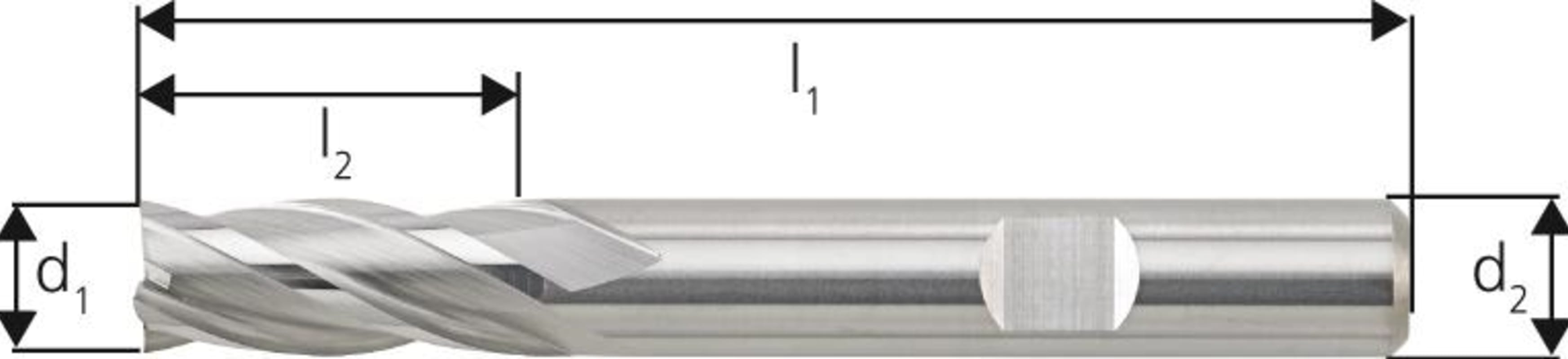 VHM-Schaftfräser, blank• Ausführung: lang • VHM • Typ N • 4 Schneiden • DIN 6527-L • DIN 6535-HB • Zum Umfangsfräsen, Besäumen, Schlichtfräsen, für die universelle Bearbeitung • Drallwinkel 3