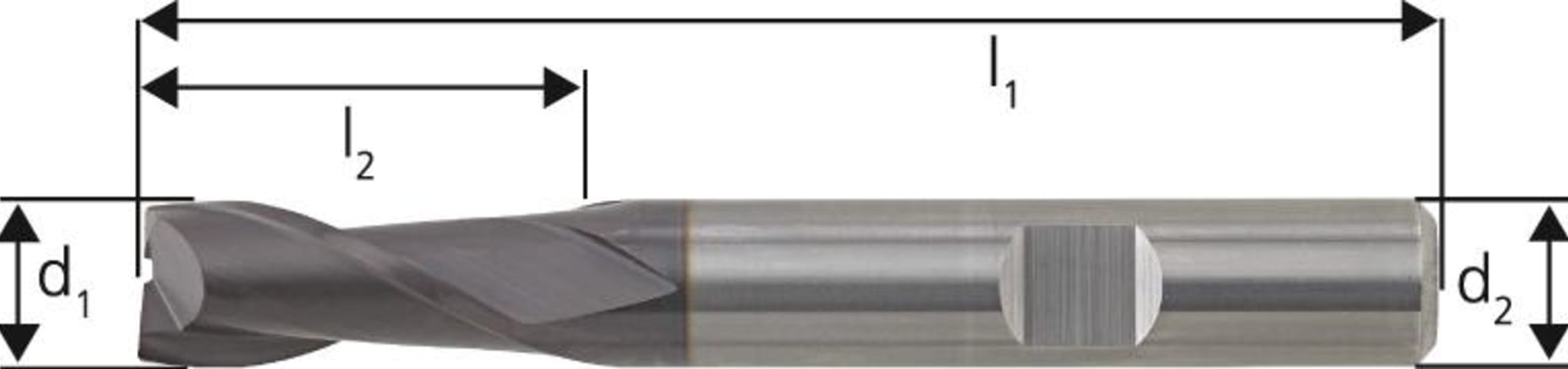 VHM-Schaftfräser, TiAlN-beschichtet• Ausführung: lang • VHM UF • Typ N • 2 Schneiden • DIN 6527 • DIN 6535-HB • Drallwinkel 30° • Für die universelle Bearbeitung sowie zum Nutenfräsen geeig