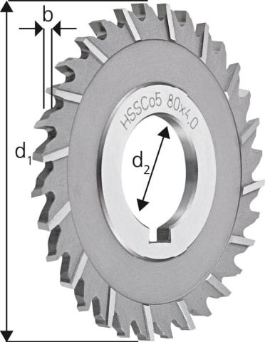 Scheibenfräser, schmal• HSS-Co5 • Typ H • DIN 1834 Form A • Zylindrische Bohrung mit Längsnut nach DIN 138 • Kreuzverzahnt • Drallwinkel 10° • Spanwinkel 12° • Zum Fräsen von Schlitzen und Nute