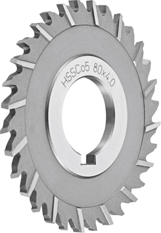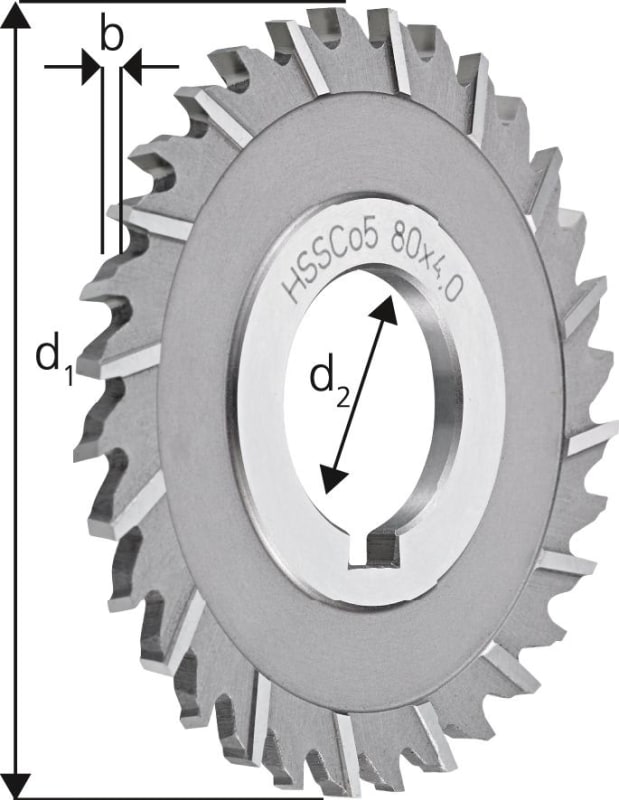 Scheibenfräser, schmal• HSS-Co5 • Typ H • DIN 1834 Form A • Zylindrische Bohrung mit Längsnut nach DIN 138 • Kreuzverzahnt • Drallwinkel 10° • Spanwinkel 12° • Zum Fräsen von Schlitzen und Nute