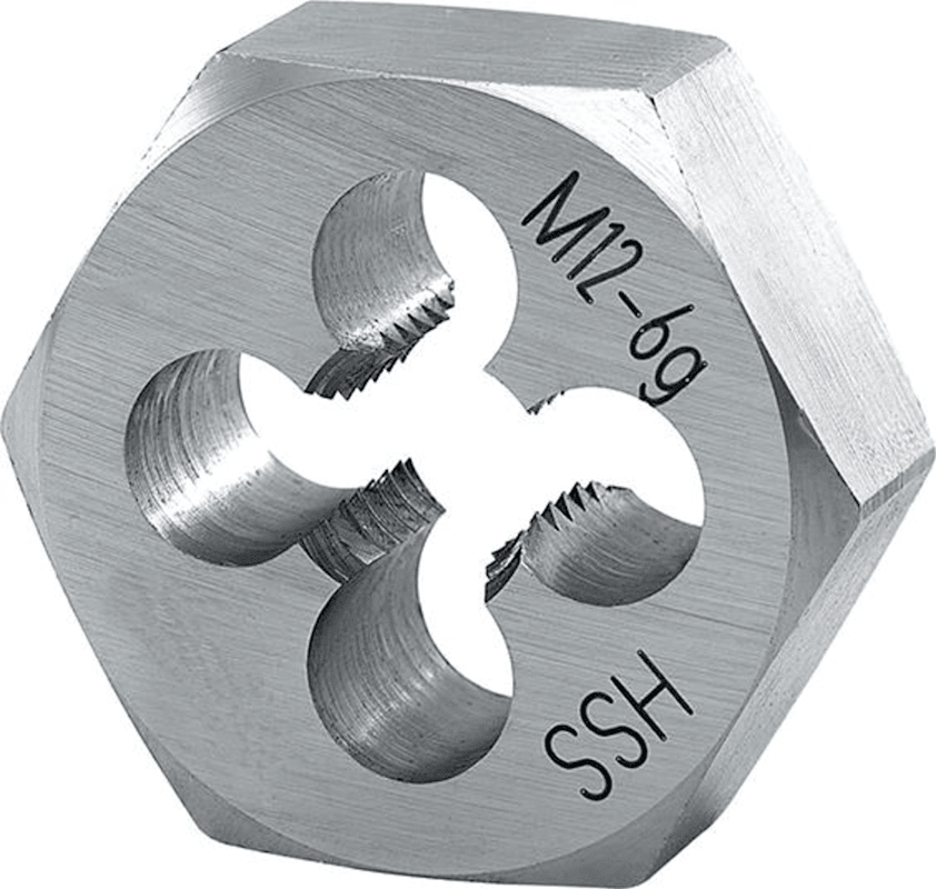 6-kant-Schneideisen, blank• Metrisches ISO-Regelgewinde DIN 13 • HSS • DIN 382 • Toleranz 6g • Lehrenhaltige Außengewinde • Für genormte Schlüsselmaße • Anschnitt 1,75 x Steigung • Ohne Schäla