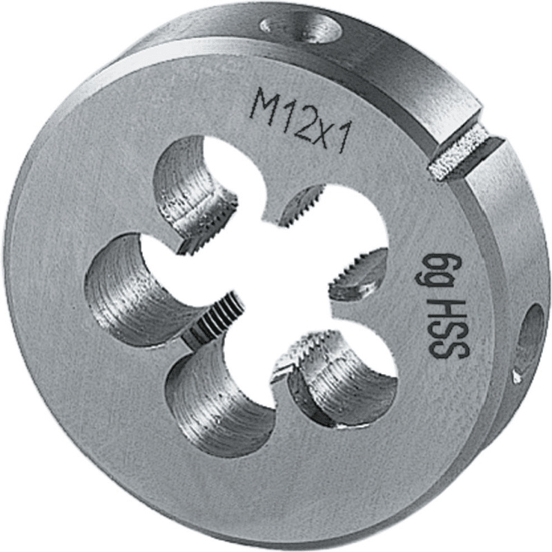 Schneideisen, blank• Metrisches ISO-Feingewinde DIN 13 • HSS • DIN EN 22568 • Toleranz 6g • Geschlossene, vorgeschlitzte Form • Anschnitt 1,75 x Steigung • Lehrenhaltige Außengewinde • Schälans