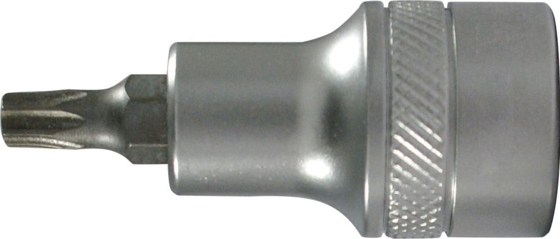 Schraubendreher-Einsatz 1/2" für TORX®-Schrauben• Seidenmattes Finish • Qualitätsstahl C60 • Spitze matt grau • 4-kant-Antrieb DIN 3120-D 12,5; ISO 1174 • Kugelfangrille • Griffig gerändelt