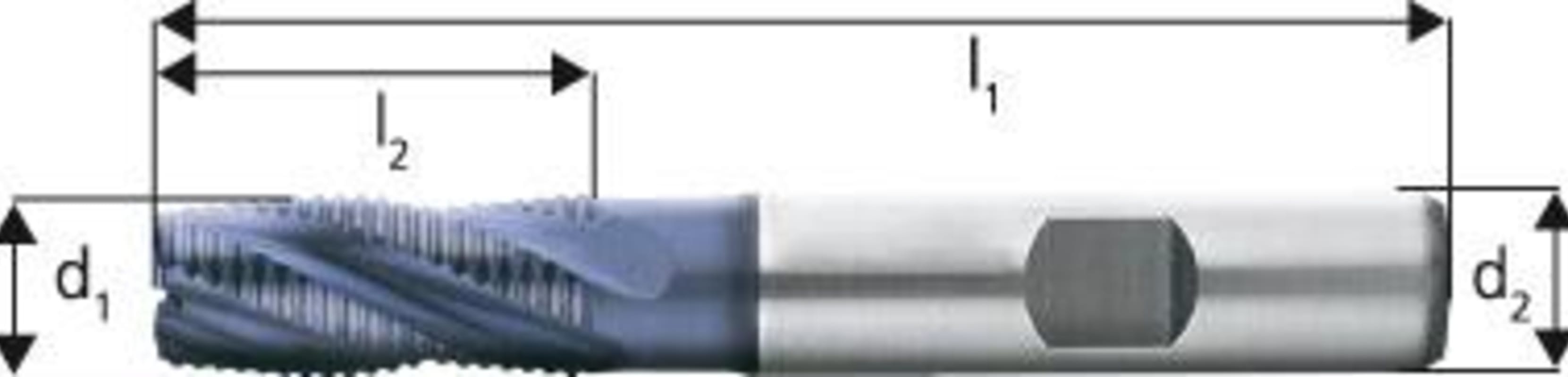 Schruppfräser, TiAlN-beschichtet• Ausführung: kurz • HSS-Co10 • Typ HR • 3–4 Schneiden • DIN 844-K • DIN 1835-B • Drallwinkel 30° • Zum Umfangs- und Bohrfräsen • Mit Zentrumschnitt • Span
