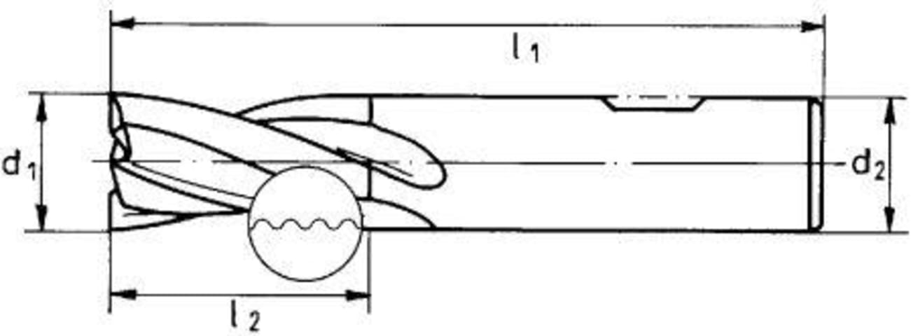 Schruppfräser, TiAlN-beschichtet• Ausführung: kurz • HSS-Co10 • Typ HR • 3–4 Schneiden • DIN 844-K • DIN 1835-B • Drallwinkel 30° • Zum Umfangs- und Bohrfräsen • Mit Zentrumschnitt • Span